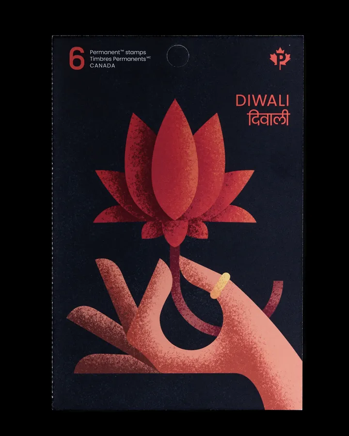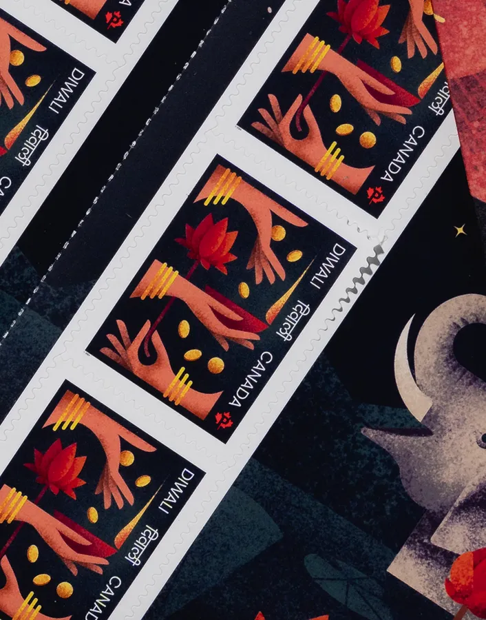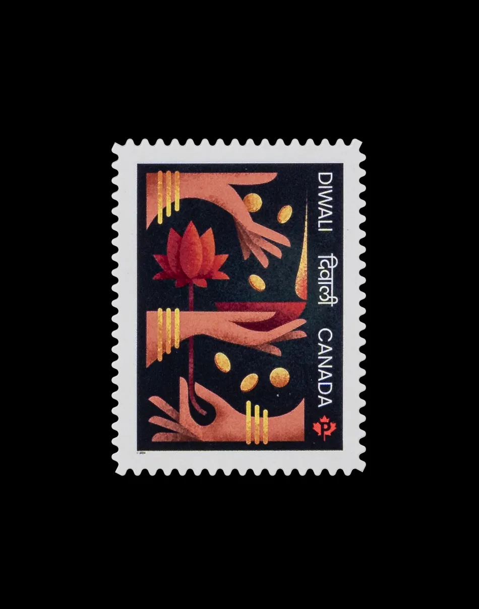 Creating a stamp for Canada Post’s Diwali 2024 issue marked a meaningful milestone for me personally and for the studio. Being able to design something so small, yet capable of traveling into people’s homes and carrying light and joy, was an absolute honour. I led the creative direction and concept, focusing on Lakshmi and the third day of Diwali, centered on prosperity, gratitude, and light. The design draws from Lakshmi’s iconic mudras and symbolic gestures, and was brought to life in collaboration with Reena Mistry of Humble Raja, who absoultey nailed the illustration.